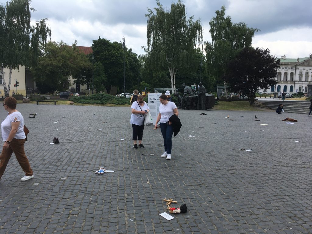 Przede wszystkim osoby, które podchodzą – zwłaszcza, gdy przestrzeń jest bardzo otwarta, widoczna z daleka – myślą, że ktoś rozrzucił śmieci. Pojawia się nawet oburzenie: co tu się dzieje, niech to ktoś sprzątnie! Ale w momencie, gdy się przybliżają do tego „śmiecia” – to jest i fascynujące, i poruszające – widzą tabliczkę. To zwykła, biała lub czarna tabliczka. Jest na niej tylko imię. I nagle to przestaje być śmieć, to czyjaś własność. Ten przedmiot jest czymś znanym z życia – są tu garnek, okulary, zabawka – ale związany jest z jakąś konkretną osobą. I to jest moment, w którym zainteresowani zaczynają odkrywać dla siebie tę instalację, wchodzą w bardziej emocjonalny etap, związany ze zrozumieniem historii, jaka się za nią kryje.