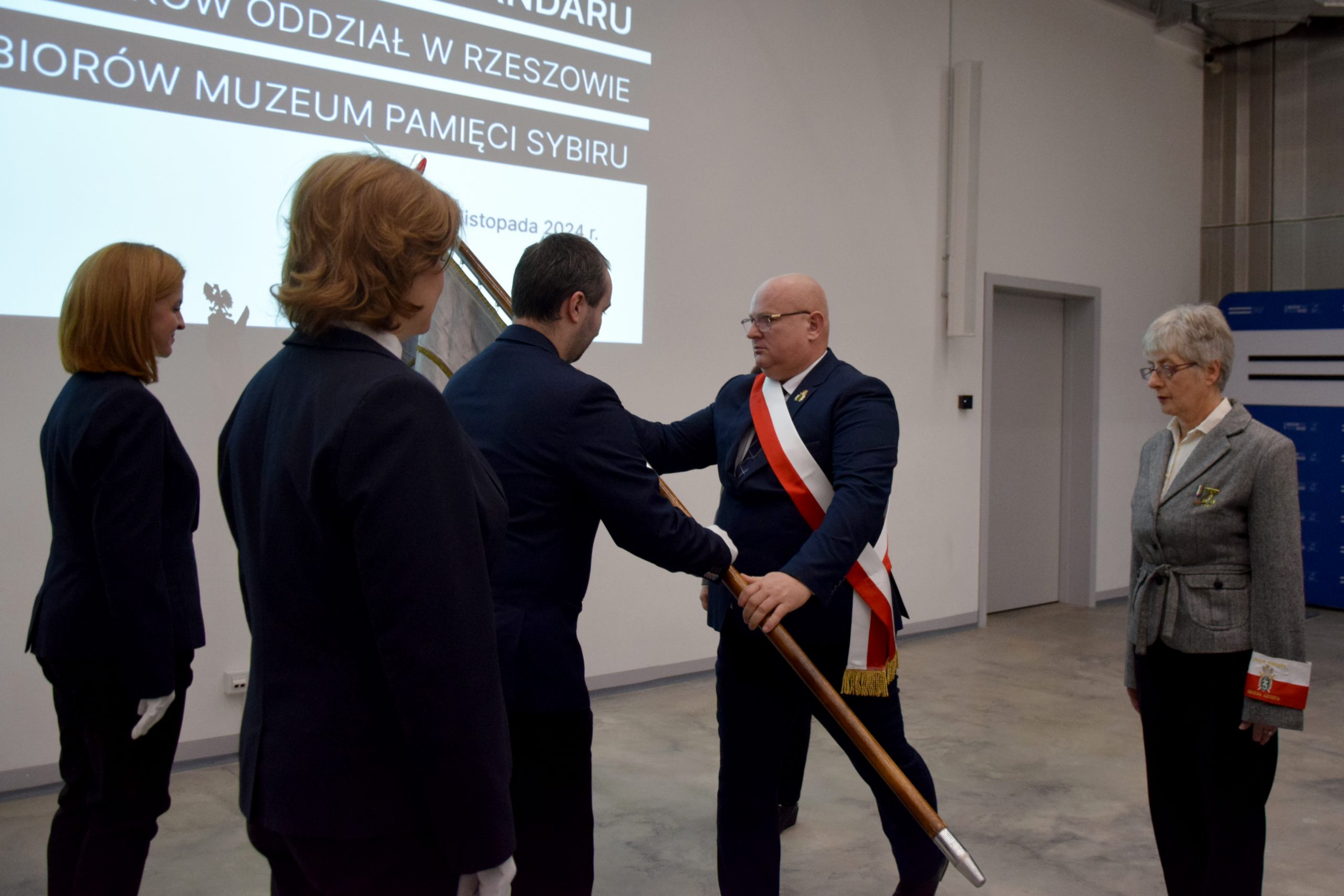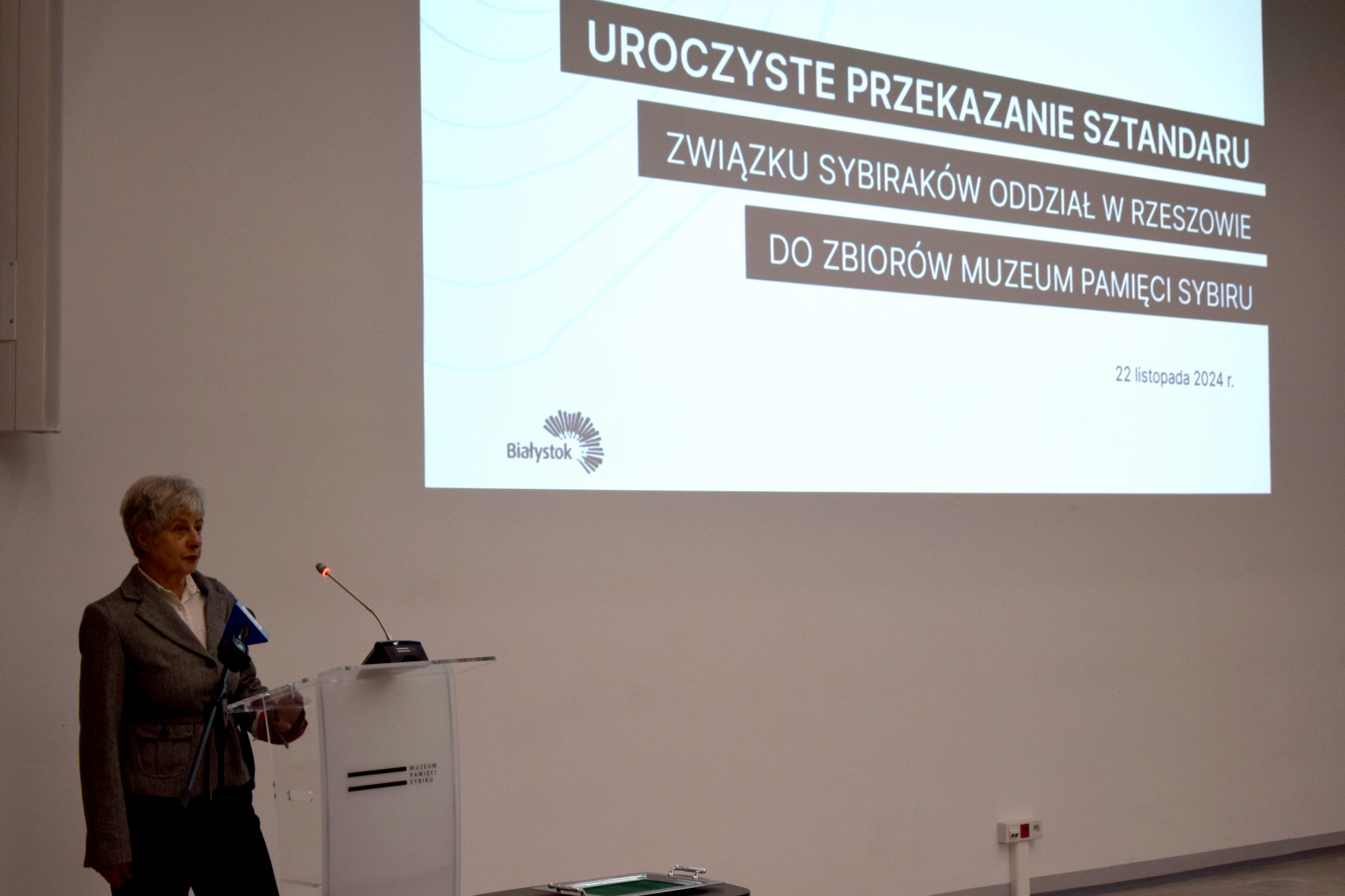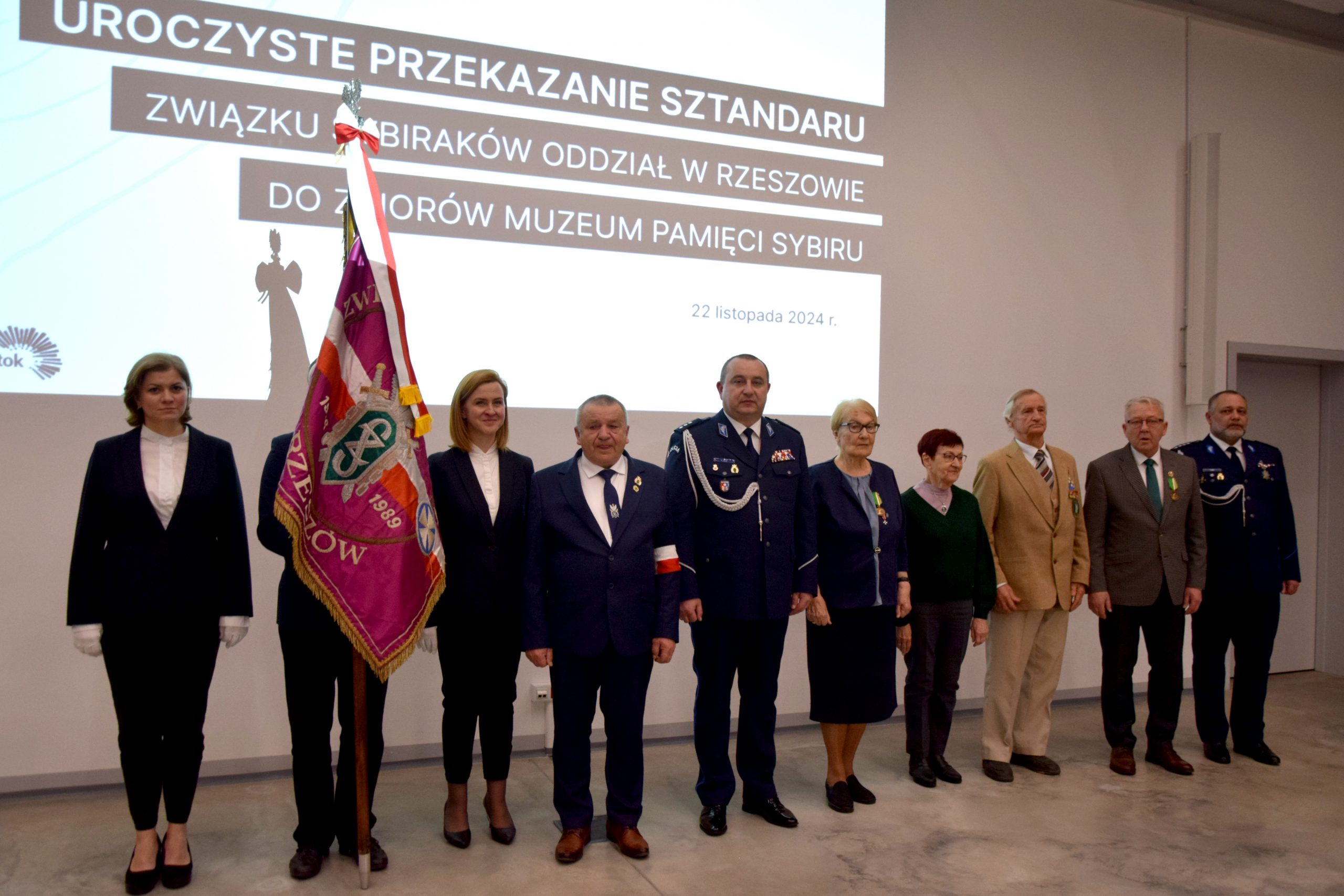 – Sztandar Związku Sybiraków Oddział w Rzeszowie został ufundowany przez jego członków. Myślą przewodnią wykonania sztandaru była maksyma „Sybiracy sami sobie i społeczeństwu województwa rzeszowskiego na pamiątkę zesłań na Sybir”. W 1993 r. ks. bp Kazimierz Górny – ówczesny ordynariusz Diecezji Rzeszowskiej poświęcił sztandar. Od tej pory poczet sztandarowy wraz ze sztandarem przez niemal 32 lata czynnie uczestniczył w uroczystościach patriotyczno-religijnych i innych wydarzeniach na terenie Podkarpacia i Polski. Członkowie rzeszowskiego oddziału wraz z pocztem sztandarowym wielokrotnie uczestniczyli w Międzynarodowych Marszach Pamięci Zesłańców Sybiru w Białymstoku. W związku z ogólnym zniszczeniem, powstałym na skutek upływu czasu, sztandar został wycofany z użytkowania, a jego miejsce zajęła nowa, identyczna replika ufundowana przez Urząd ds. Kombatantów i Osób Represjonowanych. W czerwcu 2024 r. zarząd oddziału Związku Sybiraków w Rzeszowie podjął decyzję o przekazaniu wycofanego sztandaru do Muzeum Pamięci Sybiru w Białymstoku – mówił.