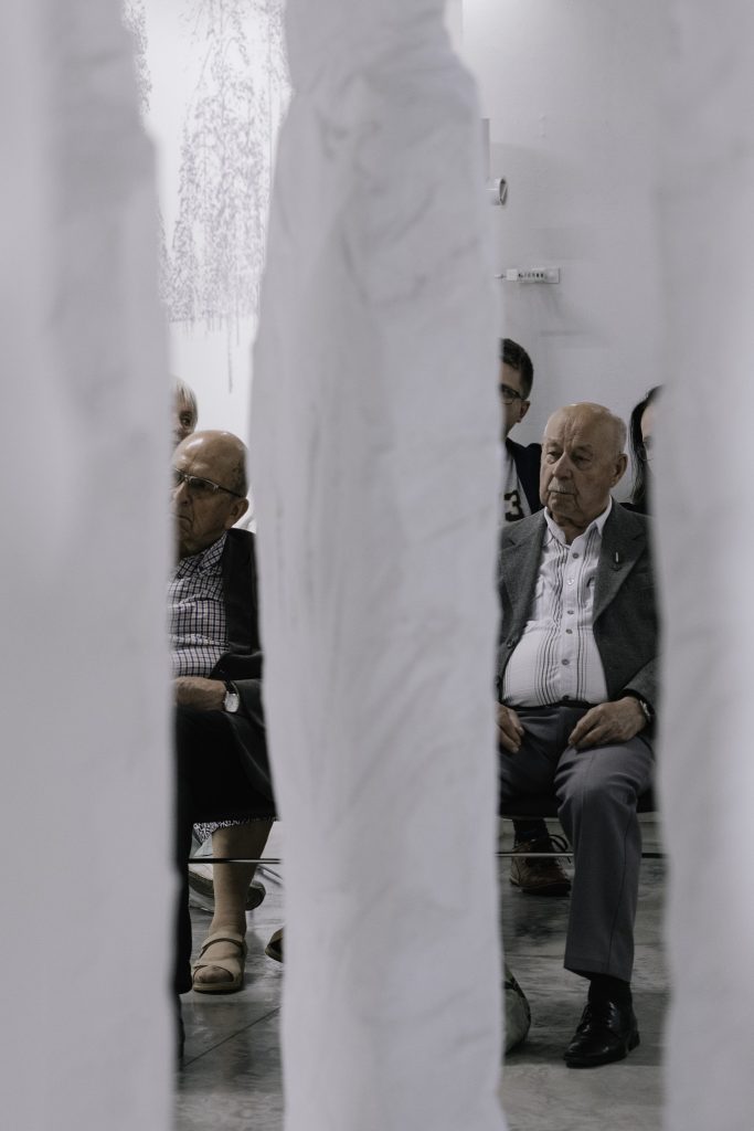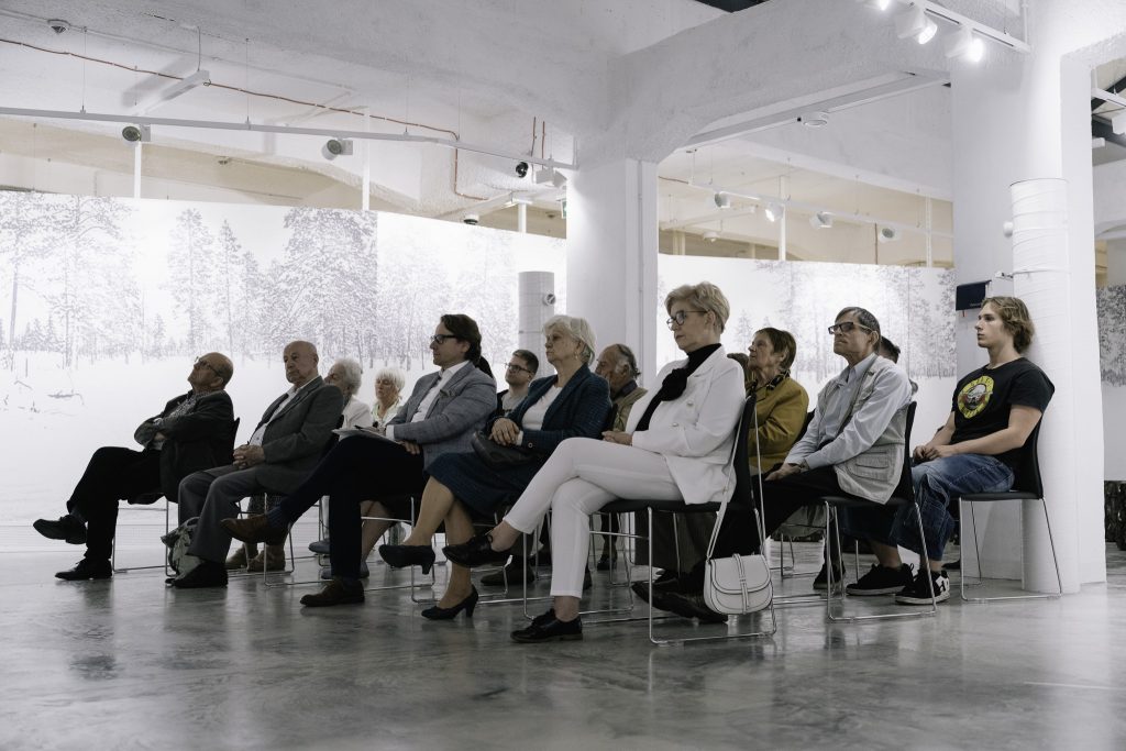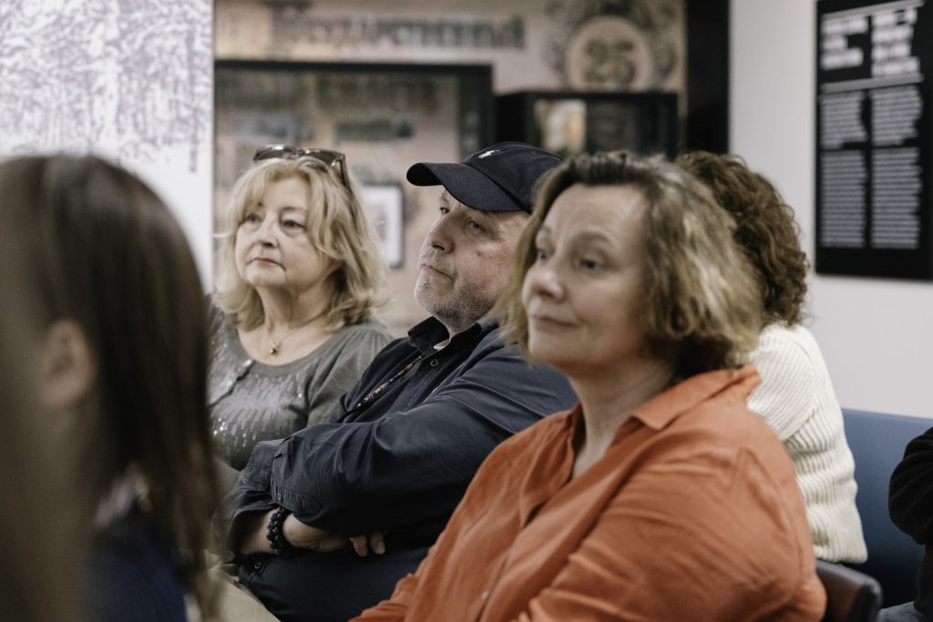 Трогательный, ностальгический, красивый – такими словами слушатели описывали репортаж «Сибирские участи» Александры Садокерской, предпремьера которого состоялась в пространстве постоянной выставки Музея памяти Сибири. Место прослушивания было выбрано не случайно. Гости сели вокруг экспозиции, являющейся одной из центральных инсталляций этого пространства – белых силуэтов людей, символизирующих ссыльных.
